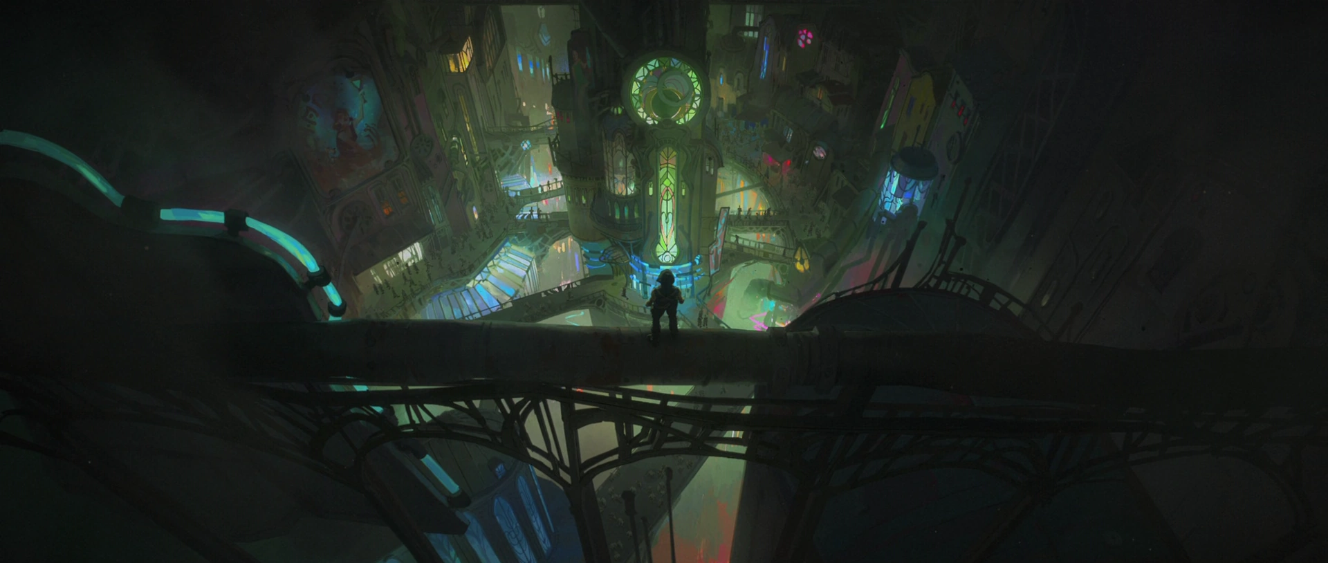 The color blue is often associated with Piltover, the advanced city above ground, as it is a city of progress and innovation, and blue is often seen as a color of stability and trust. In contrast, the color purple is often associated with Zaun, the undercity, as it is a city of chaos and danger, and purple is often seen as a color of mystery and danger. The color red is also used in Arcane to represent danger and power, like for shimmer which is represented in the warm tones. On the contrary, the color green is used in Arcane to represent hope and healing.